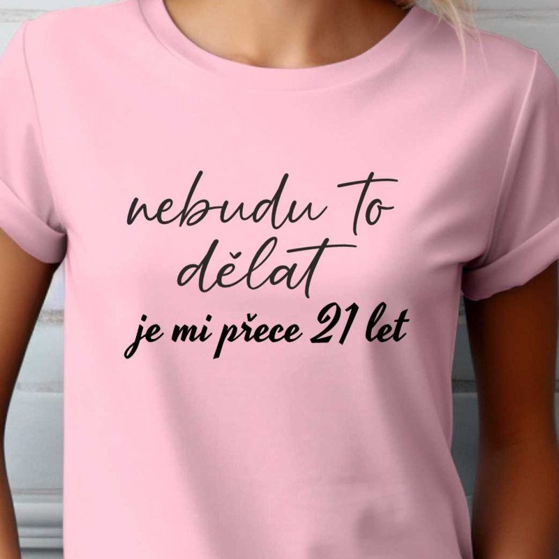Dámské tričko s vtipným potiskem: Nebudu to dělat je mi přece 21 let je určeno jako dárek k 21. narozeninám.