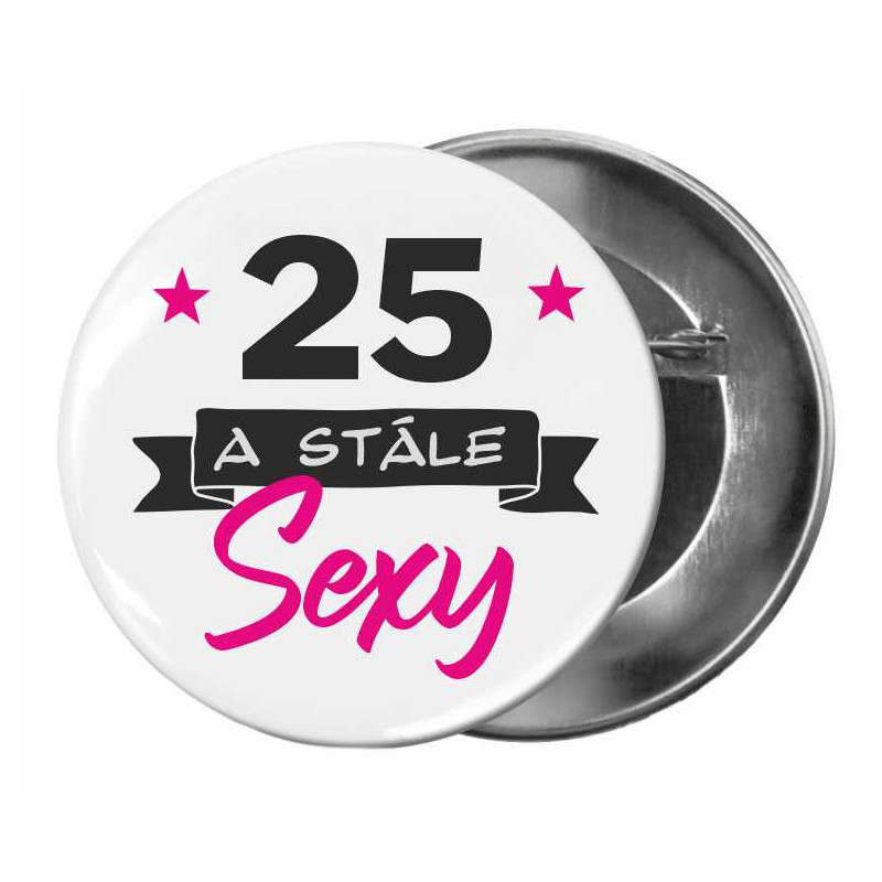 Text na buttonu je "25 a stále sexy". Ideální dekorační dárek pro oslavence 25. narozenin na narozeninovou oslavu nebo párty.