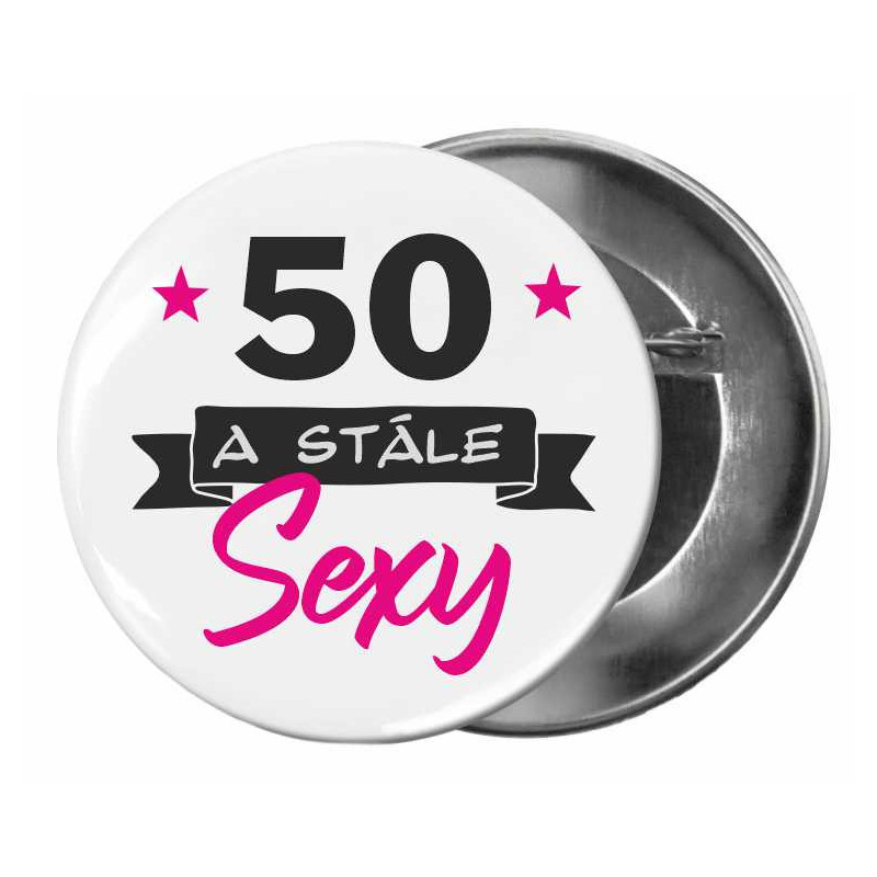 Text na buttonu je "50 a stále sexy". Ideální dekorační dárek pro oslavence 50. narozenin na narozeninovou oslavu nebo párty.