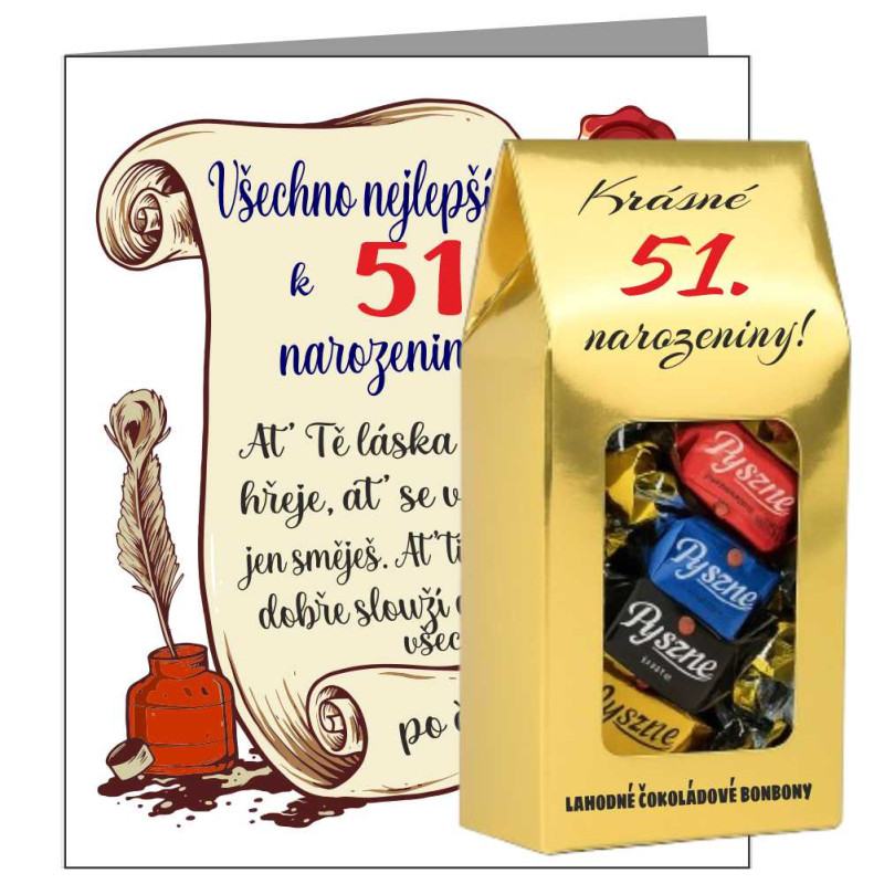 Hledáte drobnost, která dodá vašemu daru tu správnou jiskru? Padesát jednička je věk, který si zaslouží oslavu s nadhledem a humorem. Naše přání s vtipným potiskem k 51. narozeninám je navrženo tak, aby okamžitě prolomilo ledy a vykouzlilo oslavenci úsměv na tváři.