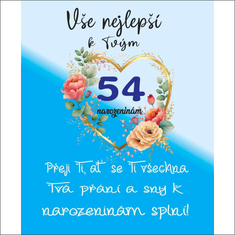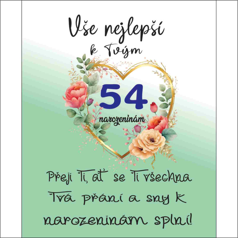 Dodejte oslavě 54. narozenin výjimečný nádech díky tomuto krásnému přání. Zkombinujte originální design s vašimi vlastními slovy a vytvořte nezapomenutelný moment. Objednejte ještě dnes!