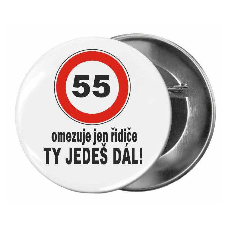 Dárková narozeninová placka se spínacím špendlíkem s věkem oslavence k 55. narozeninám.