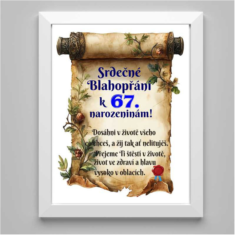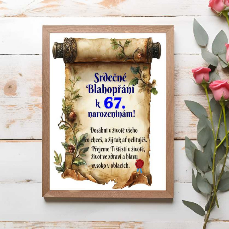 Blahopřání k 67. narozeninám s motivačním nápisem „Dosáhni v životě všeho, co chceš“ je perfektním způsobem, jak oslavenci popřát vše nejlepší a inspirovat ho k dalším snům a cílům. Díky univerzálnímu designu je vhodné pro muže i ženy.