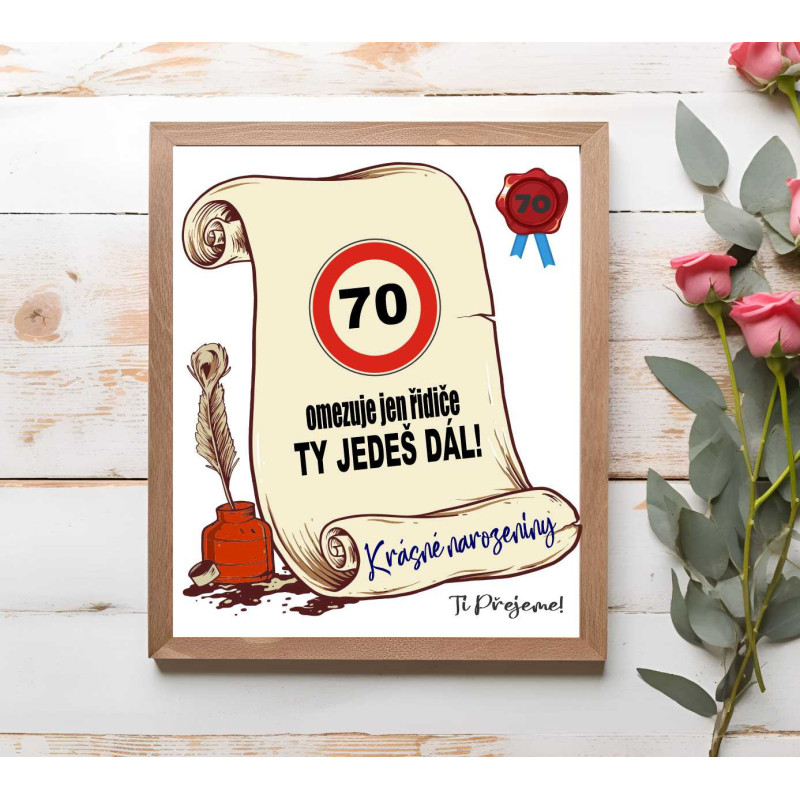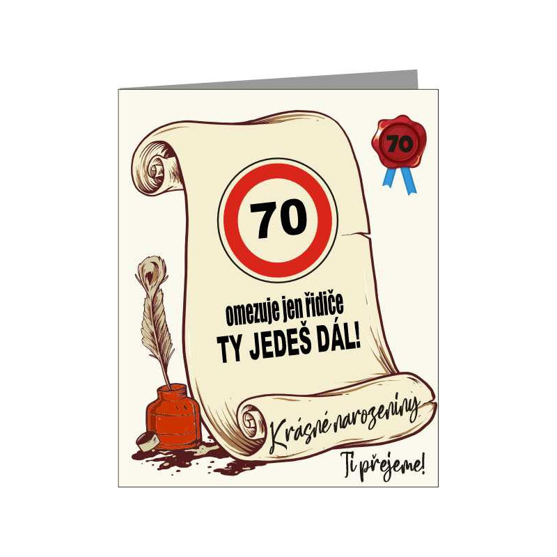 Papírové vtipné přání k 70. narozeninám pro muže – „70 omezuje jen řidiče, ty jedeš dál“ je ideální volbou pro všechny, kdo chtějí poblahopřát s humorem a šmrncem. Perfektně se hodí pro oslavence, který ani v sedmdesáti neztrácí energii, elán a chuť do života.