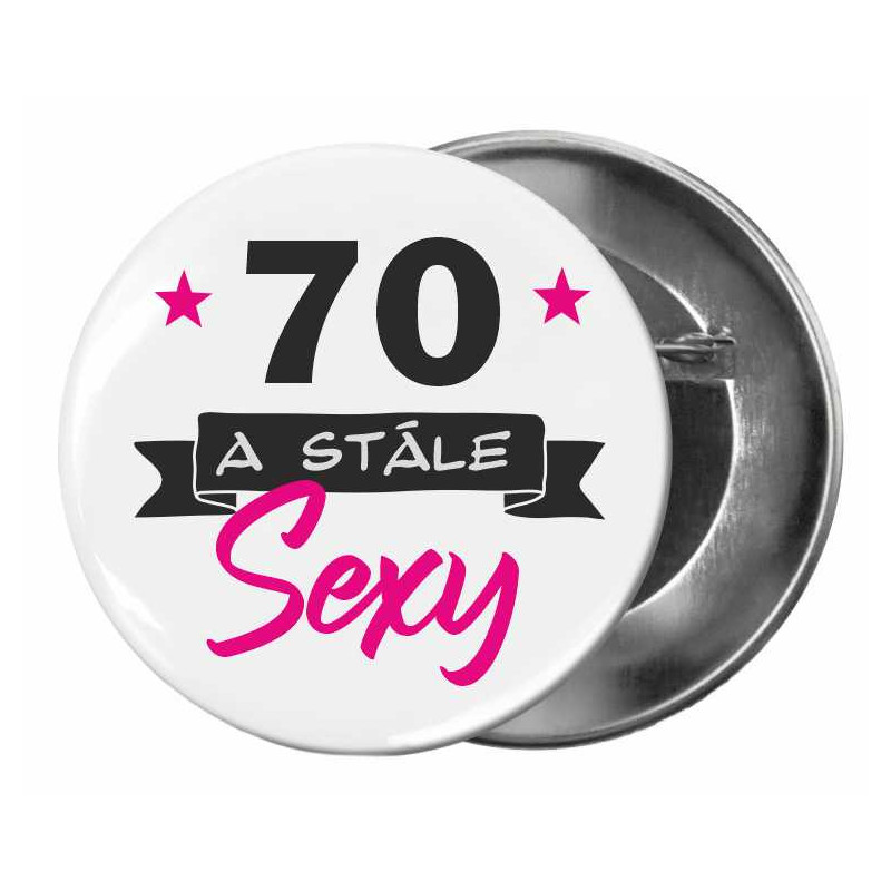 Text na buttonu je "70 a stále sexy". Ideální dekorační dárek pro oslavence 70. narozenin na narozeninovou oslavu nebo párty.