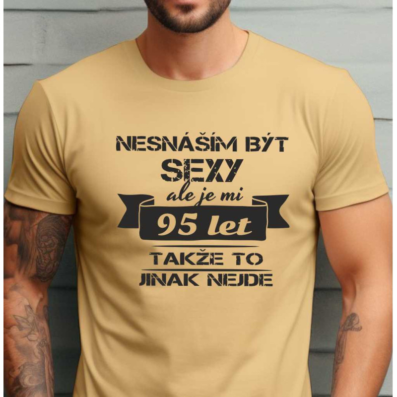 Pánské bavlněné tričko s potiskem "Nesnáším být sexy, ale je mi 95 let, takže to jinak nejde". Tričko je skvělým vtipným dárkem k 95. narozeninám a bude se všem líbit na narozeninové oslavě.