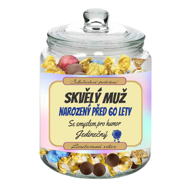 Hledáte originální dárek pro výjimečného muže, který slaví své kulaté jubileum? Tato stylová skleněná dóza plná lahodných čokoládových bonbonů je trefou do černého! Elegantní potisk „Skvělý muž narozený před 60 lety“ je decentní, vkusný a zároveň plný uznání – přesně takový, jaký si zaslouží.