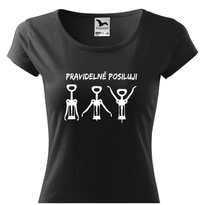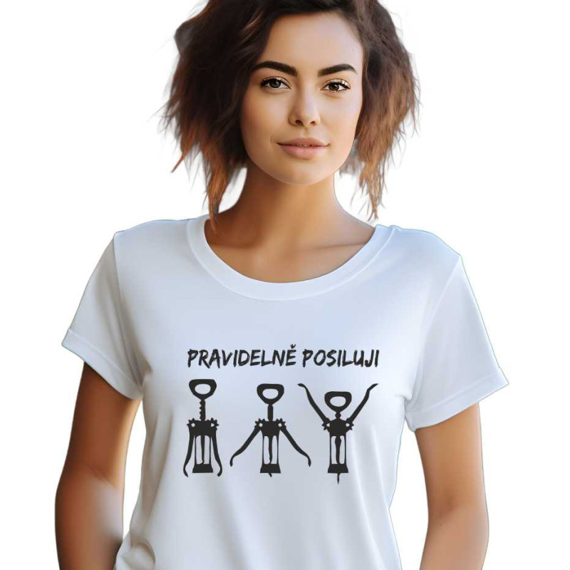 Dámské tričko s vtipným nápisem "Pravidelně posiluju" je ideální pro ženu, která ráda konzumuje víno a tričko pravidelně posiluju s vývrtkou na víno to vtipným zůsobem ukazuje. Udělejte radost sobě nebo osobě blízké s tímto tričkem, které nepotřebuje více slov.