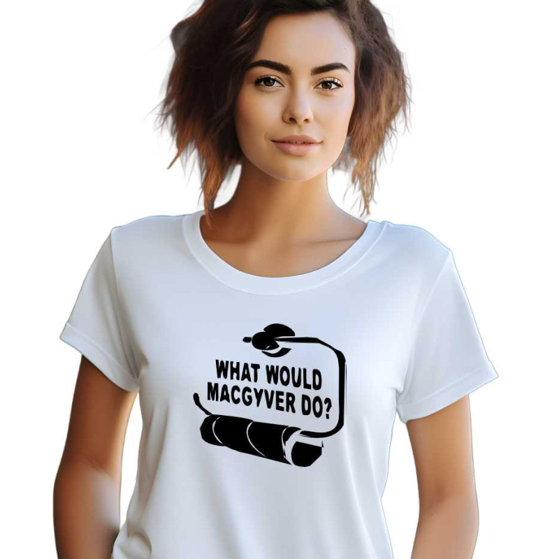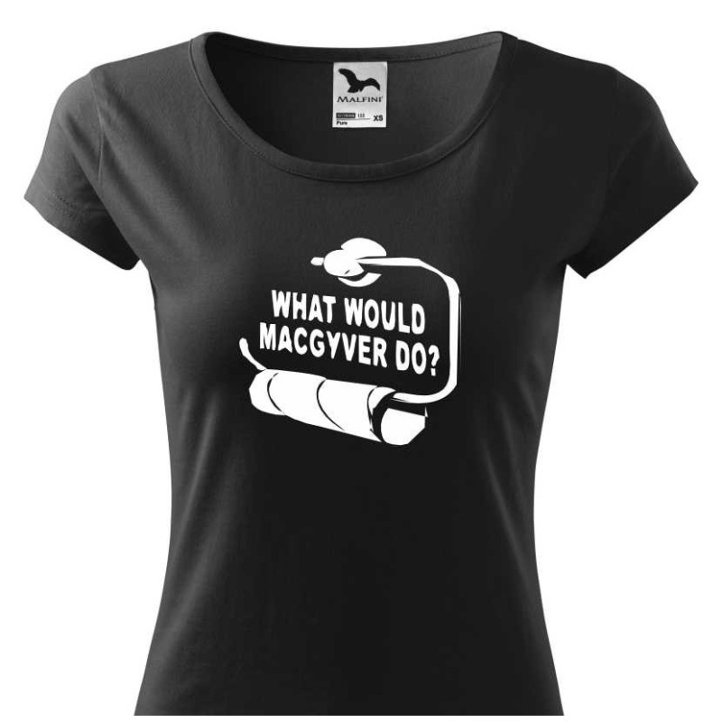 Dámské tričko s potiskem "What Would Macgyver Do". Tričko, které je určeno dívce, která zná tento seriál.