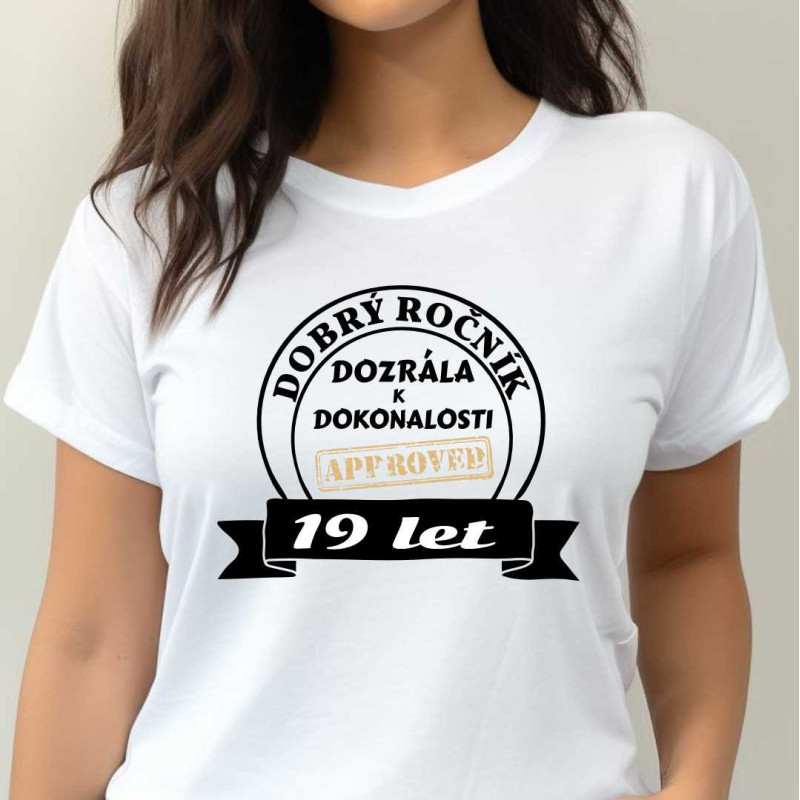 Dámské tričko s potiskem: Dobrý ročník 19 let ldozrál k dokonalosti. Tričko, které je určeno k oslavě 19. narozenin pro ženu. Skvělý dárek k 19. narozeninám v podobě kvalitního bavlněného trička.