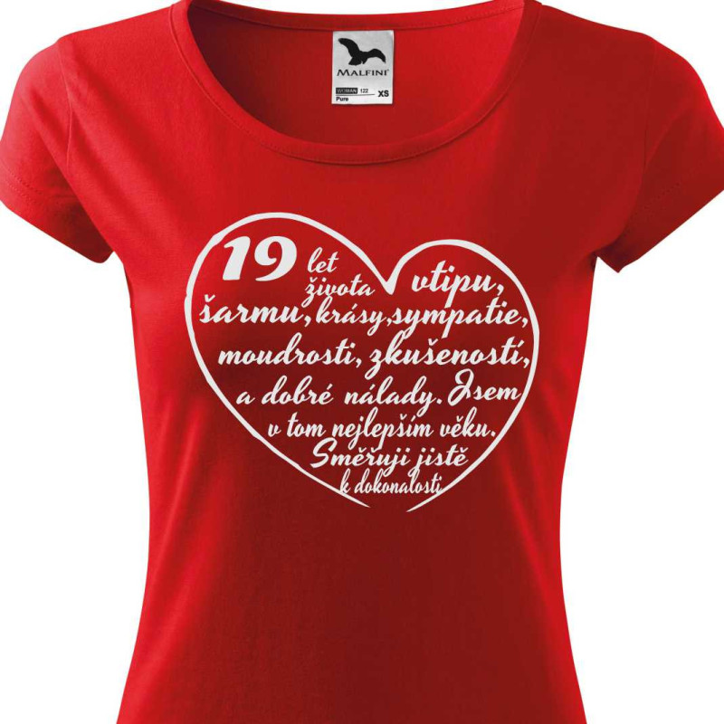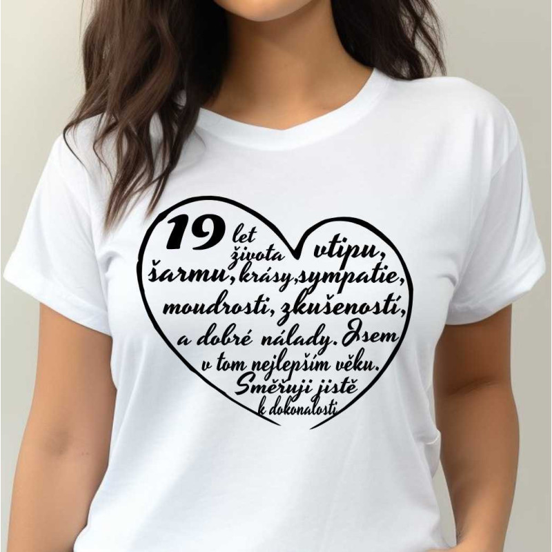 Dámské tričko s potiskem přání v srdci k 19. narozeninám. Tričko je skvělé k oslavě a také jako dárek k 19. narozeninám. Udělejte radost tímto dárkem a oslavu nezapomenutelnou s tímto originálním narozeninovým tričkem.