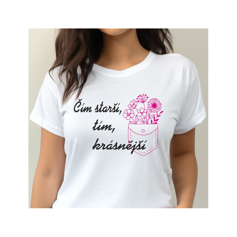 Dámské tričko 20 let – čím starší, tím krásnější s krásným květinovým motivem je ideální dárek k oslavě dvacátých narozenin! Tento potisk vyjadřuje radost z mládí i krásu, která se s věkem jen prohlubuje – perfektní volba pro každou oslavenkyni, která září sebevědomím.