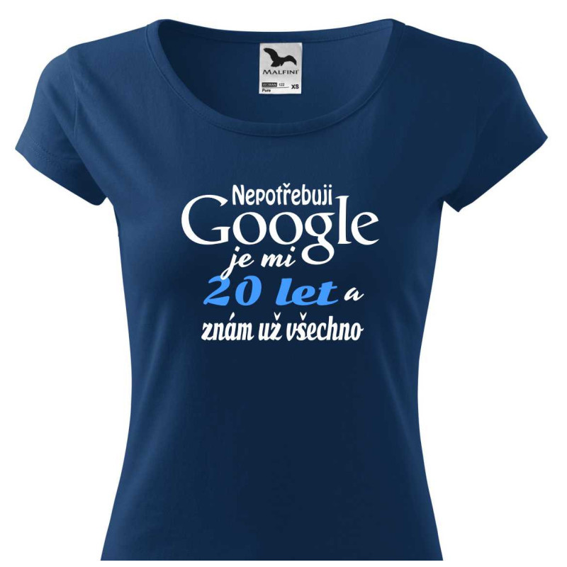 Dámské tričko s vtipným potiskem "Nepotřebuji Google je mi 20 let a znám už všechno" je originálním vtipným dárkem k 20. narozeninám. Udělejte narozeninovou oslavu 20. narozenin zábavnou a darujte tohle kvalitní bavlněné tričko, které se bude líbit.