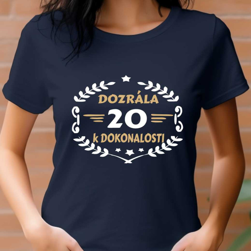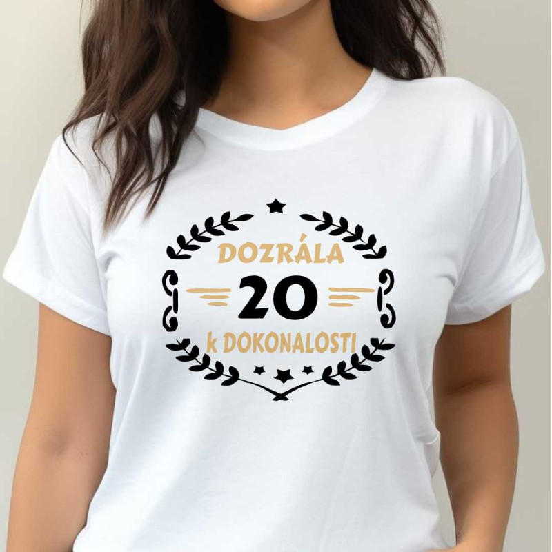Dámské tričko s vtipným potiskem: 20 let a dozrála k dokonalosti. Tričko je ideální jako dárek k 20 narozeninám, udělá velkou radost, rozveselí celou narozeninovou oslavu. Kvalitní bavlněné tričko je originální a bude také památkou na tuto nezapomenutelnou událost.
