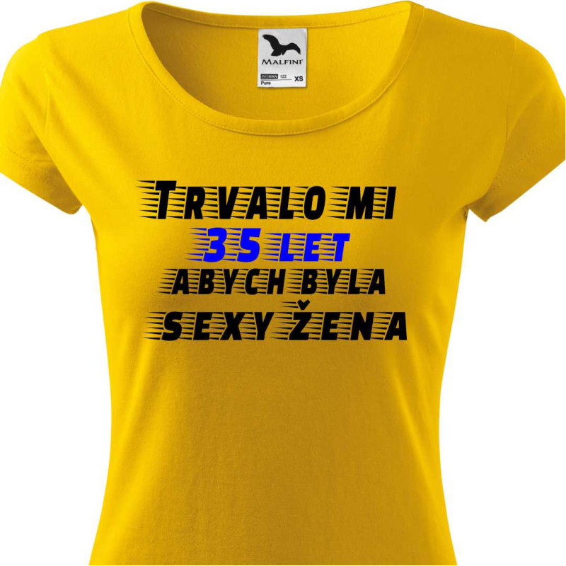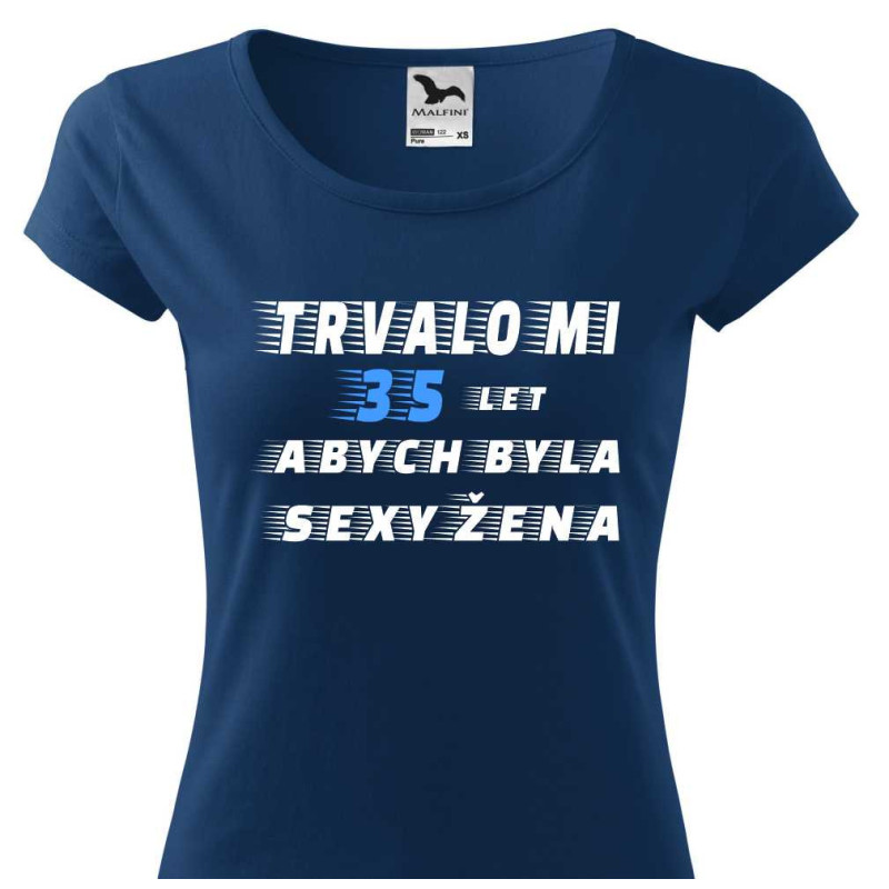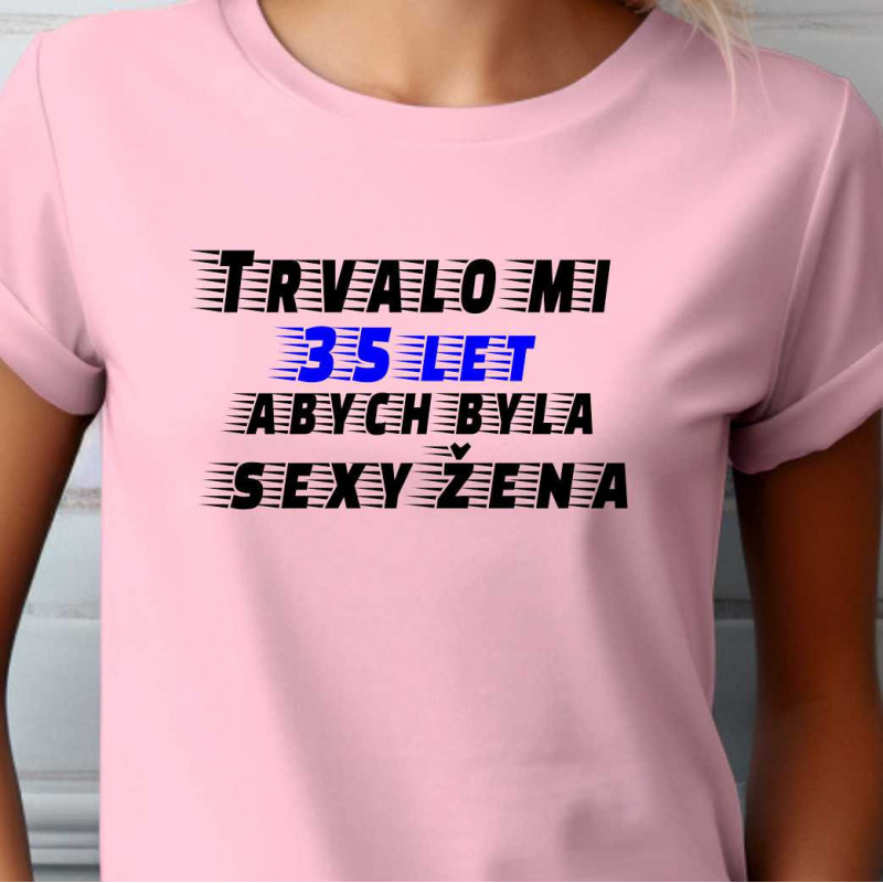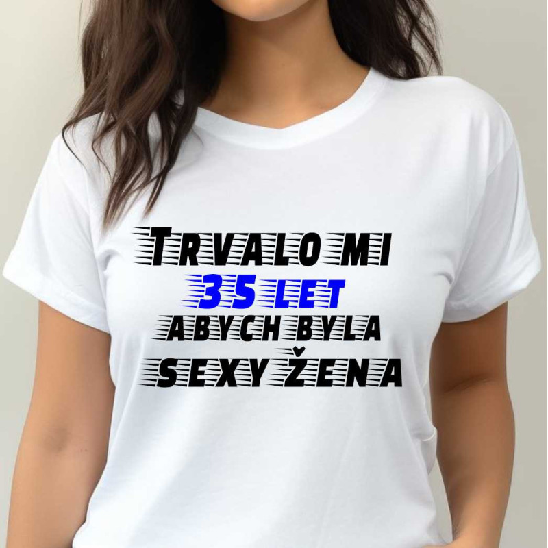 Dámské, bavlněné tričko k 35. narozeninám s potiskem "Trvalo mi 35 let, abych byla sexy žena". Vtipný dárek k 35. narozeninám pro ženu.