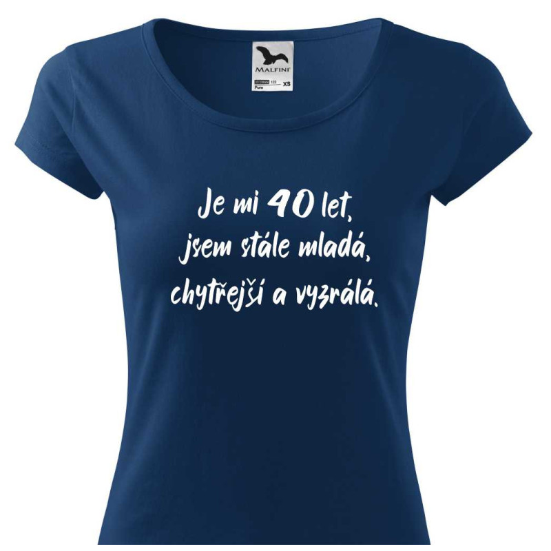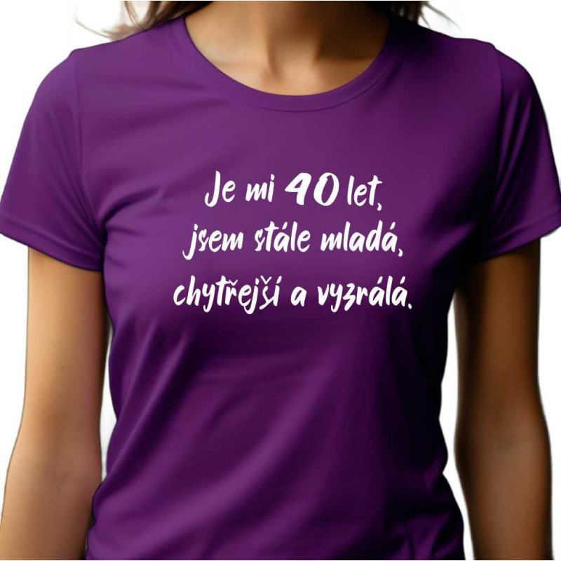 Dámské tričko s vtipným potiskem: Je mi 40 let jsem stále mladá, chytřejší a vyzrálá - je originálním vtipným dárkem k 40. narozeninám. Udělejte narozeninovou oslavu 40. narozenin zábavnou a darujte tohle kvalitní bavlněné tričko, které se bude líbit.