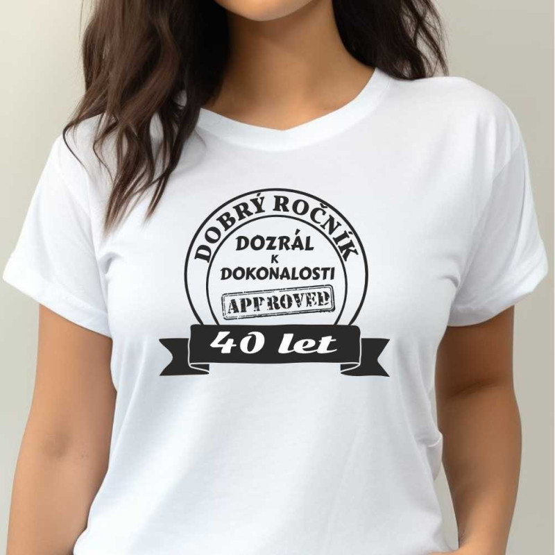 Dámské tričko s vtipným potiskem: Dobrý ročník 40 let dozrál k dokonalosti - je originálním vtipným dárkem k 40. narozeninám. Udělejte narozeninovou oslavu 40. narozenin zábavnou a darujte tohle kvalitní bavlněné tričko, které se bude líbit.