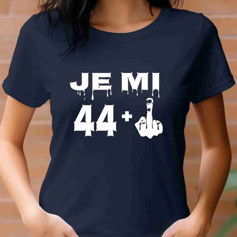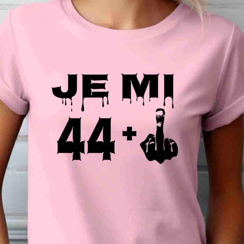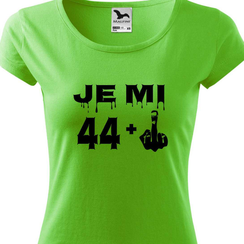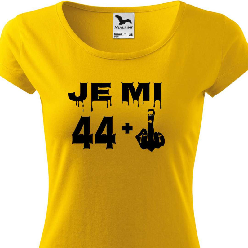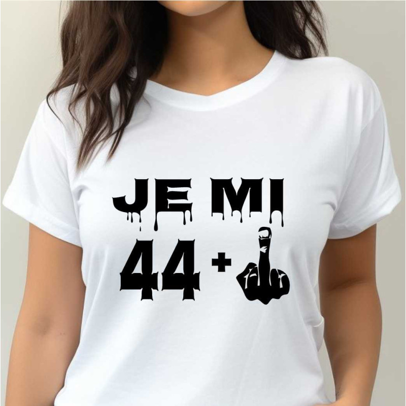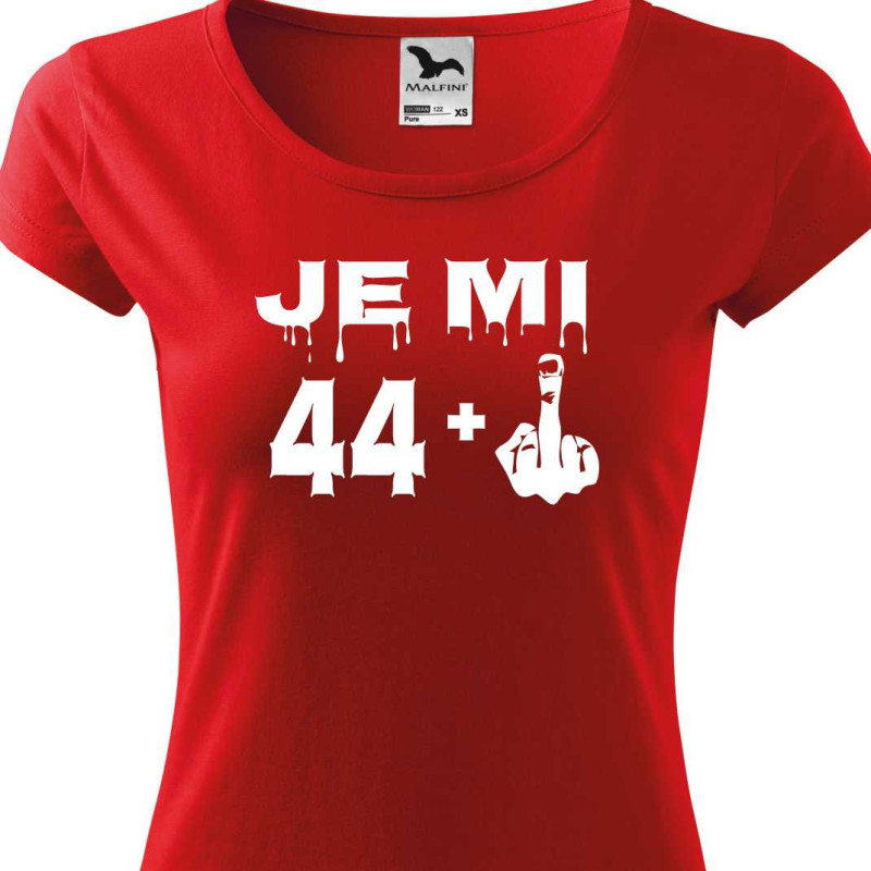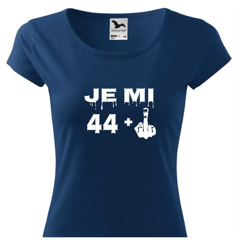 Dámské tričko s vtipným potiskem "Je mi 44 plus prostředníček" je k oslavě 45. narozenin. Udělejte radost tímto tričkem jako dárkem k 45. narozeninám osobě blízké.