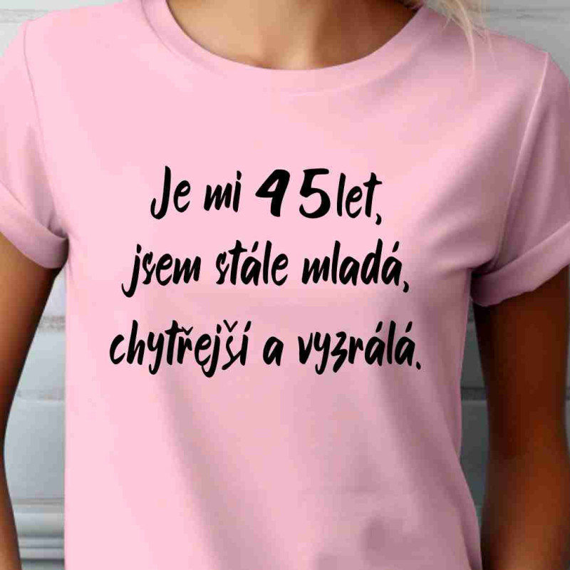 Dámské tričko s potiskem: Je mi 45 let jsem stále mladá chytřejší a vyzrálá. Tričko je ideální k oslavě 45. narozenin a také jako dárek k této příležitosti. Udělejte radost osobě blízké skvělým dárkem, který pootěší a udělá oslavu 45. narozenin dokonalou.