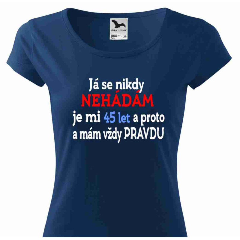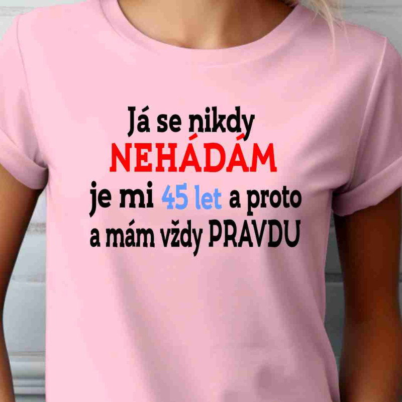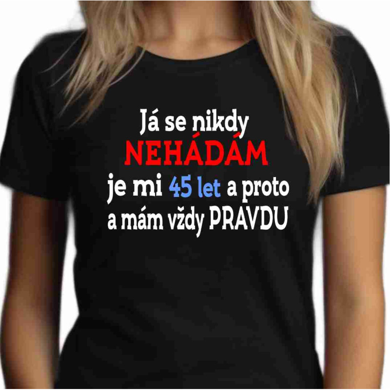 Dámské tričko s potiskem: Já se nikdy nehádám je mi 45 let. Tričko je ideální k oslavě 45. narozenin a také jako dárek k této příležitosti. Udělejte radost osobě blízké skvělým dárkem, který pootěší a udělá oslavu 45. narozenin dokonalou.