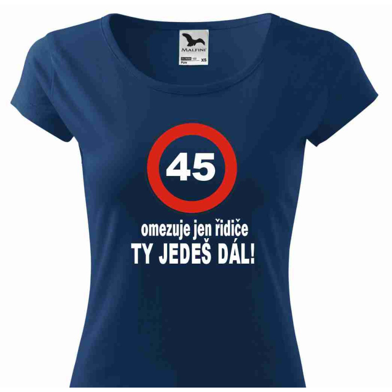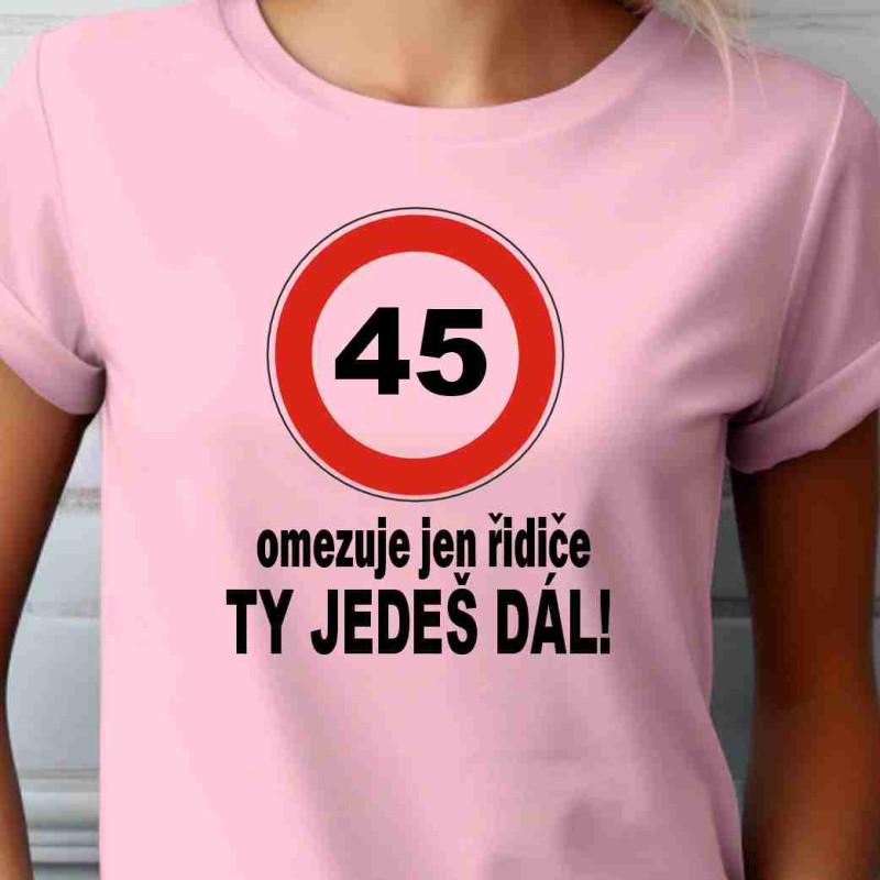 Dámské tričko s potiskem: 45 omezuje jen řidiče. Tričko je ideální k oslavě 45. narozenin a také jako dárek k této příležitosti. Udělejte radost osobě blízké skvělým dárkem, který pootěší a udělá oslavu 45. narozenin dokonalou.