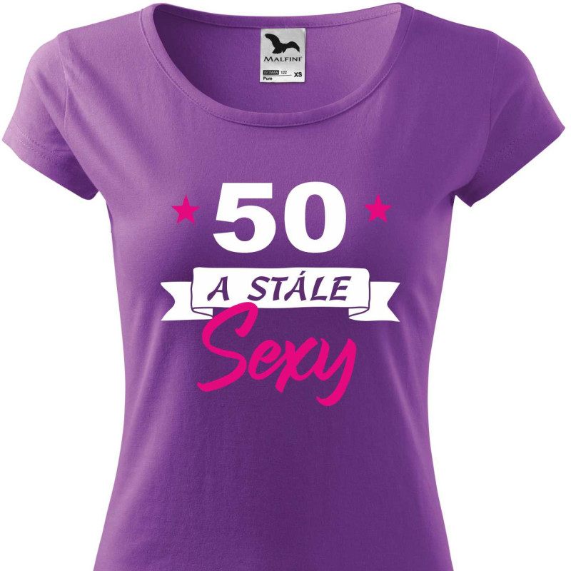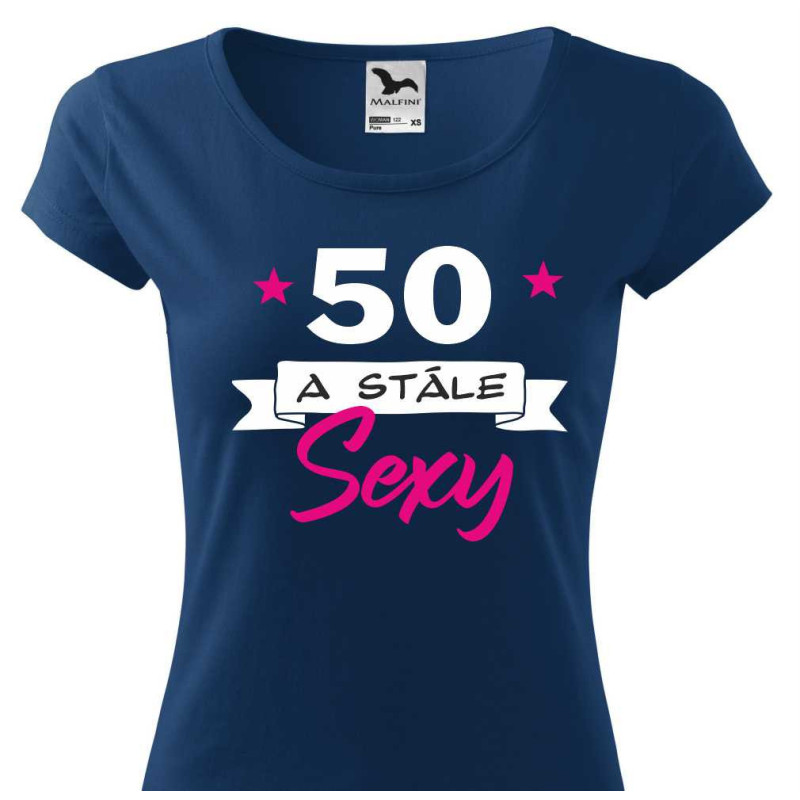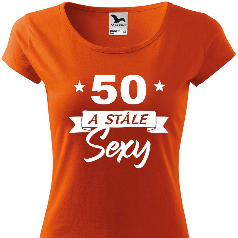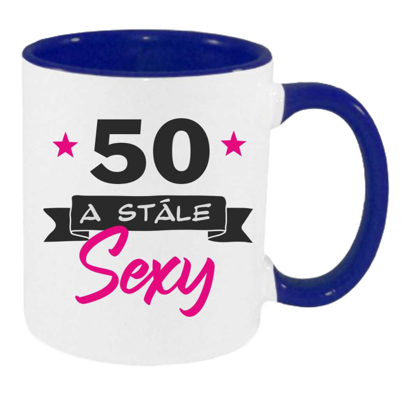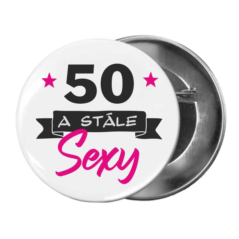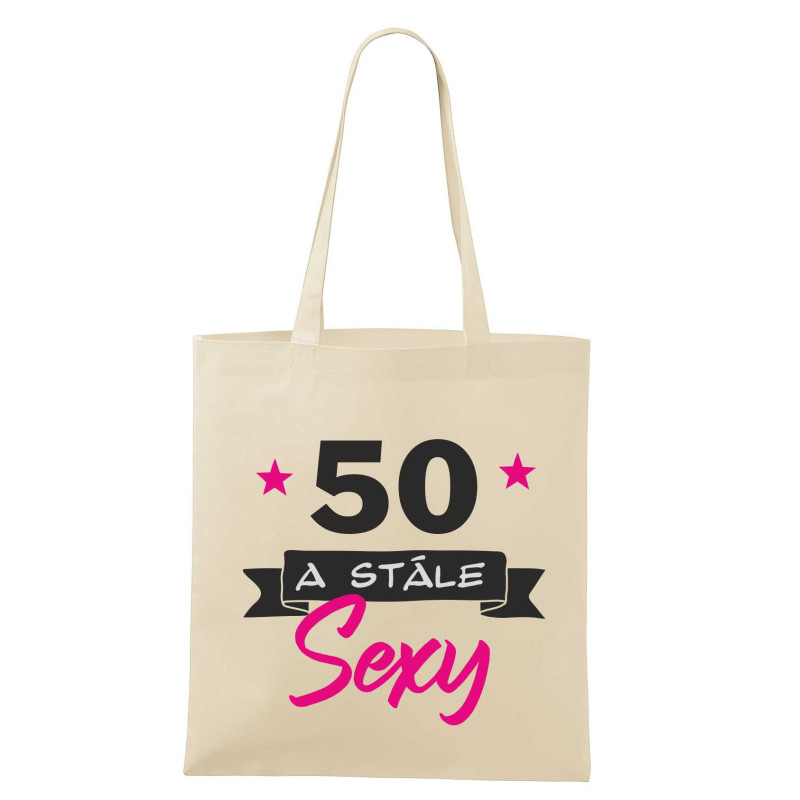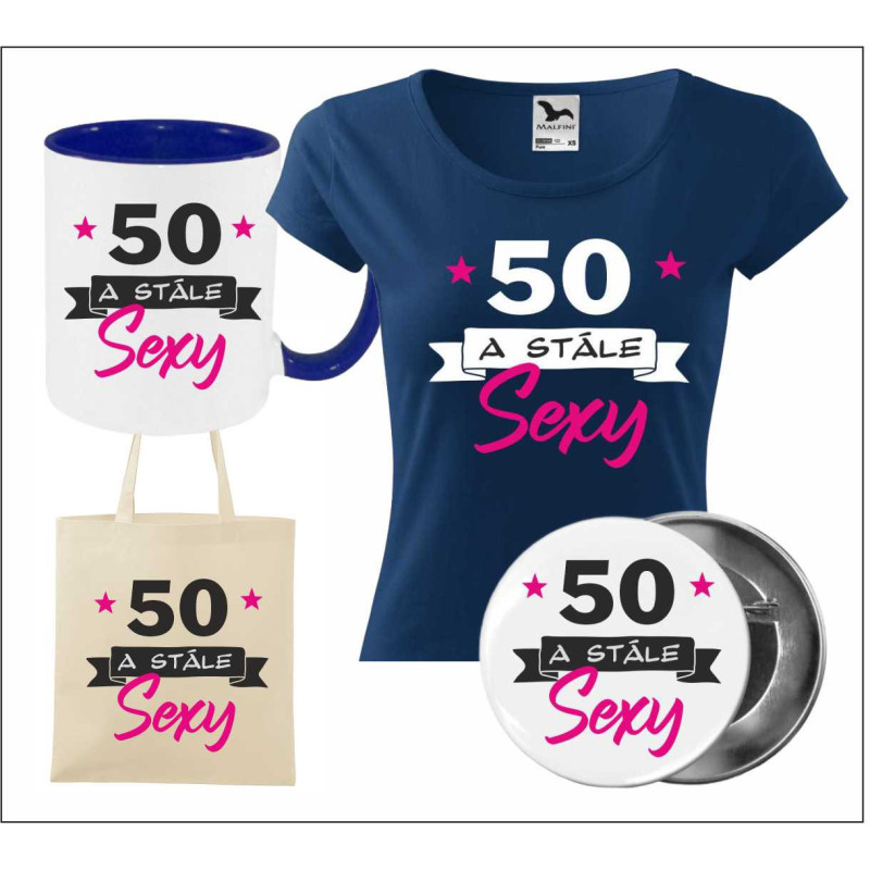 Narozeniný balíček, který je ideální jako dárek k 50 narozeninám pro ženu. Hrníček, taška, placka a tričko s potiskem: 50 a stále sexy za zvýhodněnou cenu.