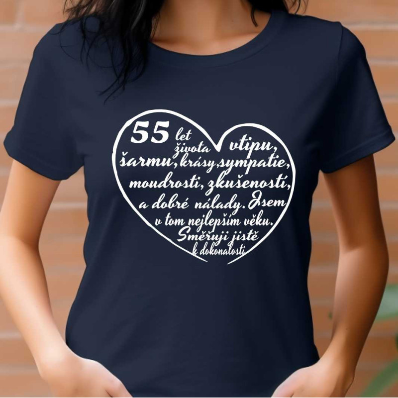 Originální design s přáním v srdci Tričko obsahuje vtipné přání k 55. narozeninám umístěné v elegantním srdci, které dodává dárku osobitý charakter. Design je nadčasový a hodí se ke každé příležitosti. Oslavenkyně ocení kombinaci humoru a stylu v jednom praktickém dárku.