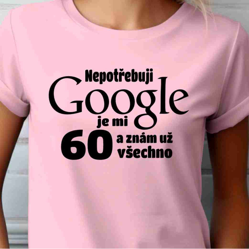 Dámské tričko s vtipným potiskem "Nepotřebuji Google je mi 60 let a znám už všechno" je originálním vtipným dárkem k 60. narozeninám. Udělejte narozeninovou oslavu 60. narozenin zábavnou a darujte tohle kvalitní bavlněné tričko, které se bude líbit.