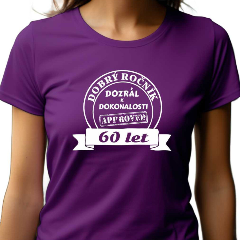 Dámské tričko s vtipným potiskem: Dobrý ročník 60 let dozrál k dokonalosti - je skvělým vtipným dárkem k 60. narozeninám. Udělejte oslavu 60. narozenin zábavnou a darujte tohle kvalitní bavlněné tričko, které udělá radost.