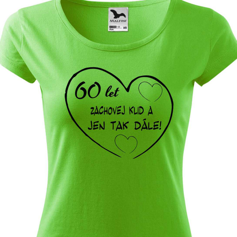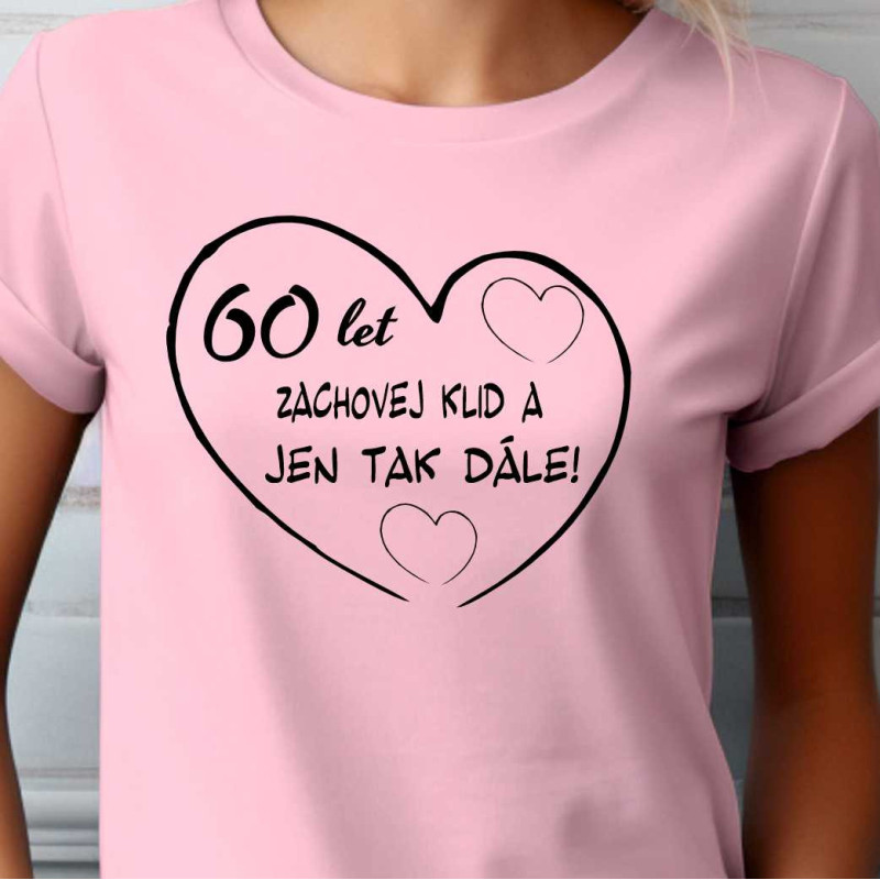 Dámské tričko s potiskem v srdci 60 let zachovej klid a jen tak dále. Tričko je skvělé k oslavě 60. narozenin. Udělejte radost osobě blízké tímto vyjímečným tričkem, které je stvořeno k oslavě narozenin.