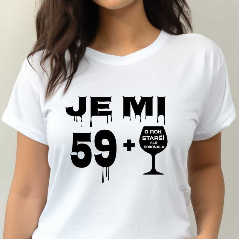 Dámské tričko s vtipným potiskem je k oslavě 60. narozenin a také na její oslavu. Udělejte radost tímto tričkem jako dárkem k 60. narozeninám osobě blízké. Originální kvalitní bavlněné tričko s potiskem čísla a sklenkou vína, které bude středem pozornosti.