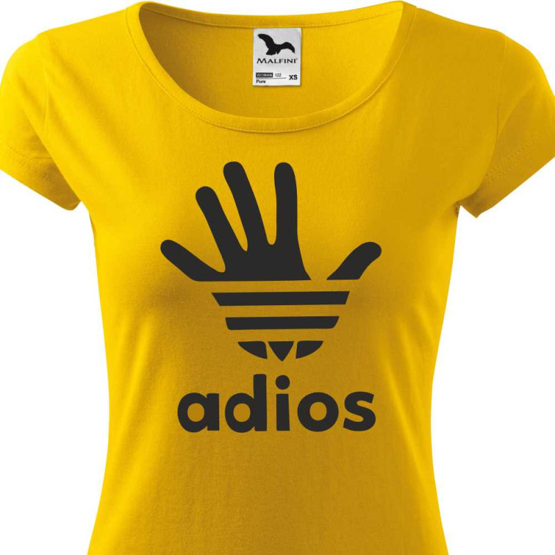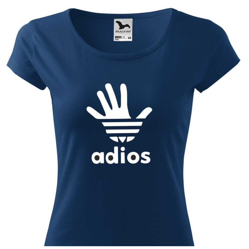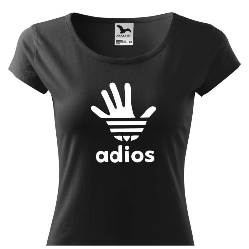 Dámské tričko s vtipným potiskem parodie "Adios v podobě adidasu". Udělejte si radost nebo osobě blízké bavlněným vtipným tričkem, které nikdy nevyjde z módy. Skvělý dárek k jakékoliv příležitosti.