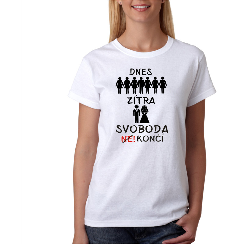 Plánujete nezapomenutelnou rozlučku se svobodou pro vaši nejlepší kamarádku? Hledáte něco, co perfektně vystihne tuto jedinečnou událost? Naše dámské tričko s vtipným nápisem "Dnes / Zítra svoboda končí" je přesně to, co potřebujete!