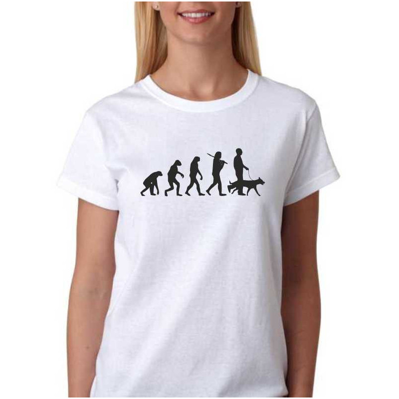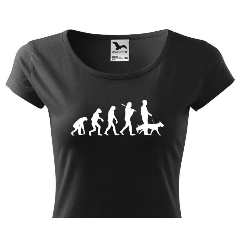 Dámské tričko s vtipným potiskem evoluce pejkařky je skvělý dárek pro všechny milovnice čtřnohých mazlíčků.