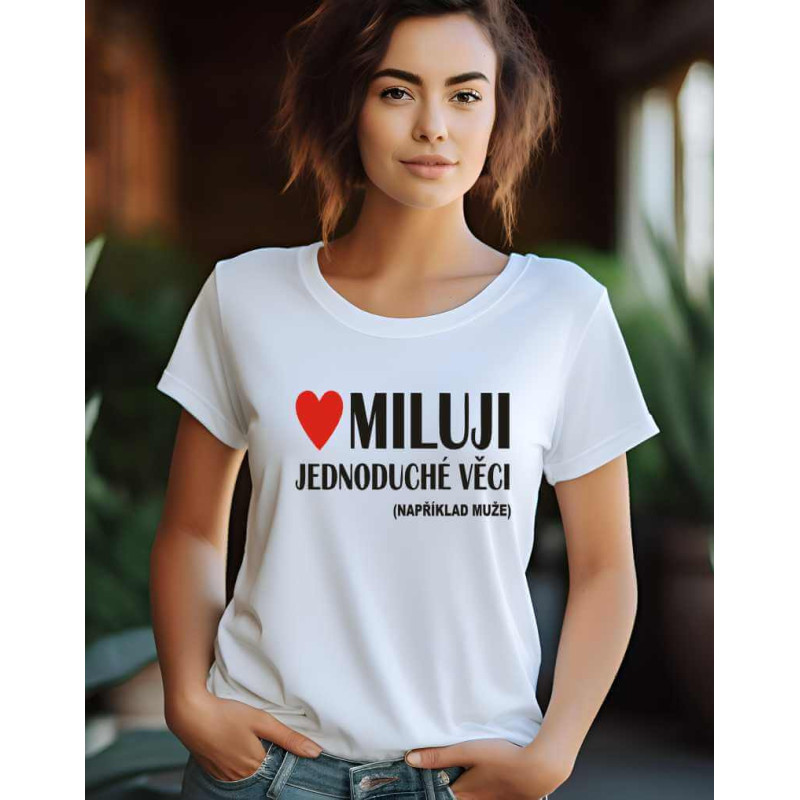 Udělejte radost sobě nebo svým blízkým tímto originálním tričkem s vtipným nápisem "Miluji jednoduché věci, například muže..." a vykouzlete úsměv na nejedné tváři!