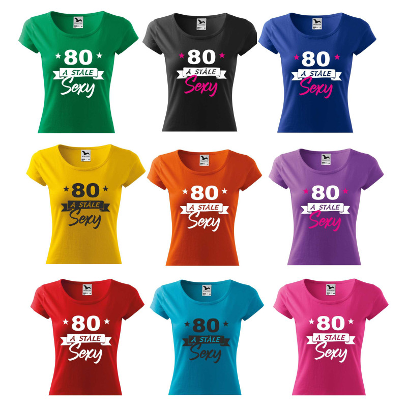 Dámské bavlněné narozeninové tričko 80 a stále sexy. Dárek k 80. narozeninám pro ženu, která rozumí humoru.