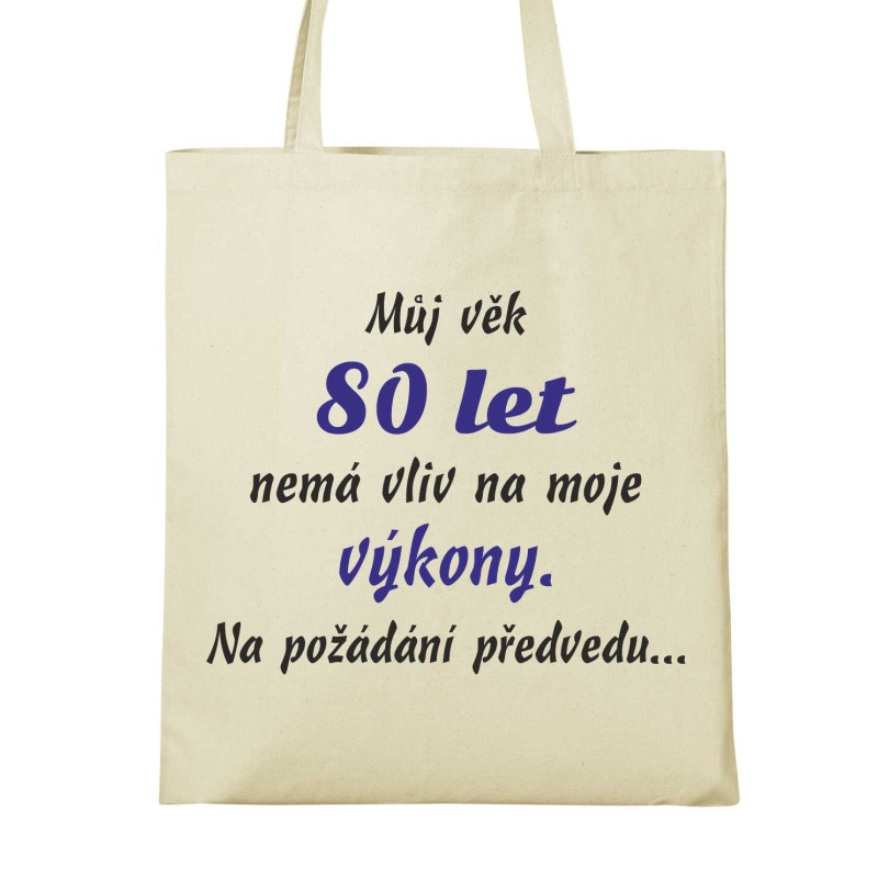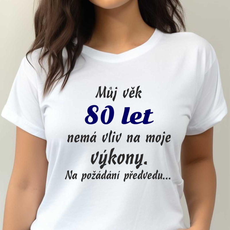 Vtipný dárek k 80. narozeninám pro ženu, která stále září energií! Tričko s nápisem „Můj věk 80 let nemá vliv na moje výkony“ je perfektní volbou pro oslavu tohoto výjimečného jubilea. Stylové, pohodlné a s nadhledem – ideální pro dámu, která i v osmdesáti ukazuje, že věk je jen číslo.