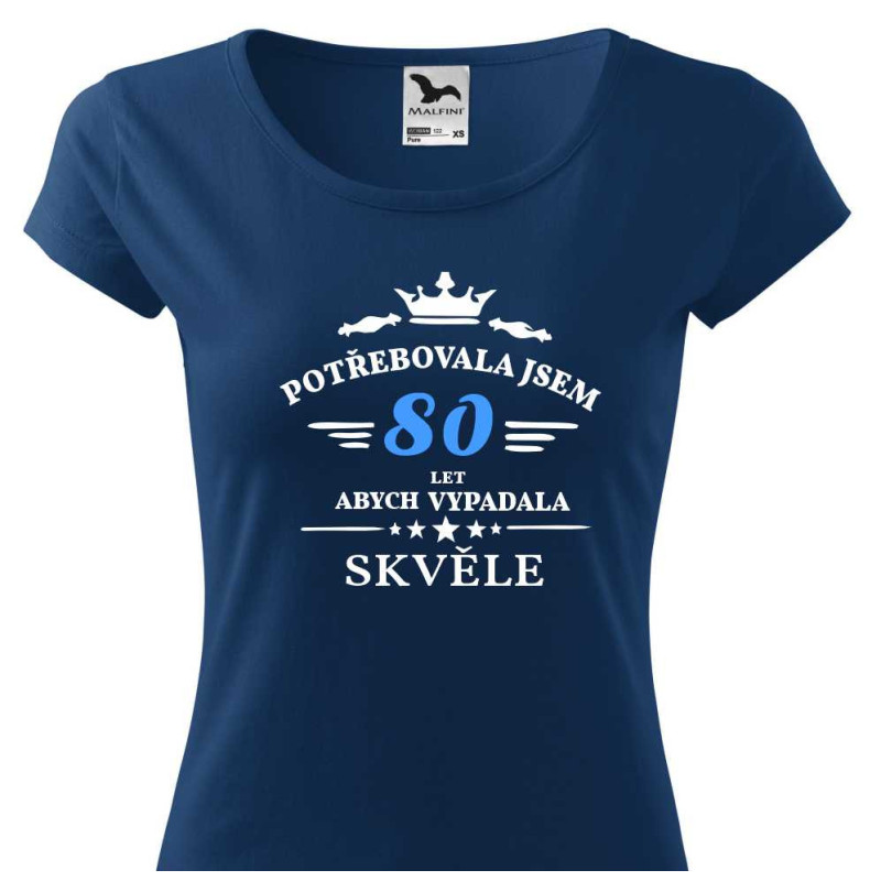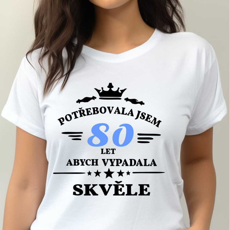 Dámské bavlněné tričko "Potřebovala jsem 80 let, abych vypadala skvěle". Vtipný dárek pro ženu k 80. narozeninám. Výborná volba pro dárek k osmdesátým narozeninám pro mámu, babičku, prababičku, tetu nebo jinou blízkou osobu., který vykouzlí úsměv a bude dlouho připomínat narozeninovou oslavu.