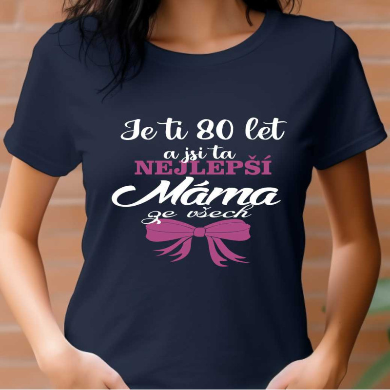 Dámské tričko s vtipným potiskem: Je ti 80 let a jsi ta nejlepší máma ze všech je originálním dárkem k 80. narozeninám pro Mámu. Tričko s potiskem vytvoří příjemnou náladu, vykouzlí úsměv a bude vzpomínkou na oslavu 80. narozenin. Udělejte radost mamince tímto tričkem s upřimným nápisem.