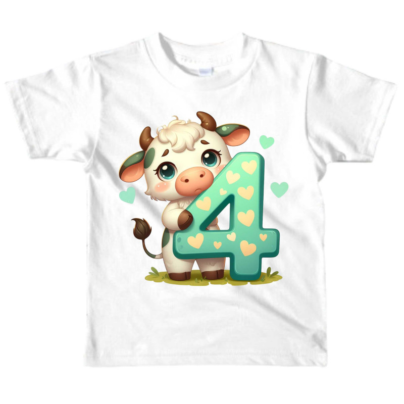 Čtvrté narozeniny jsou tady! Udělejte z nich nezapomenutelný den s tímto barevným narozeninovým tričkem, které zdobí roztomilá kravička a číslo 4. Skvělý outfit pro malého oslavence na narozeninovou party i krásná památka na tento výjimečný okamžik. Perfektní dárek k narozeninám, který vykouzlí úsměv na tváři každého dítěte! Skvělý tip na dárek pro dítě slavící 4. narozeniny.