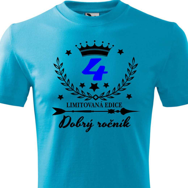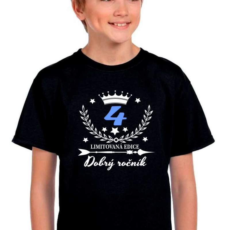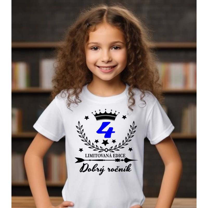 Dětské tričko s krátkým rukávem s potiskem: 4 limitovaná edice dobrý ročník. Tričko je skvělé k oslavě 4 narozenin. Udělejte radost malému oslavenci, ať už je to kolka nebo kluk. Kvalitní tričko najde použití i po oslavě a hlavně udělá velkou radost.