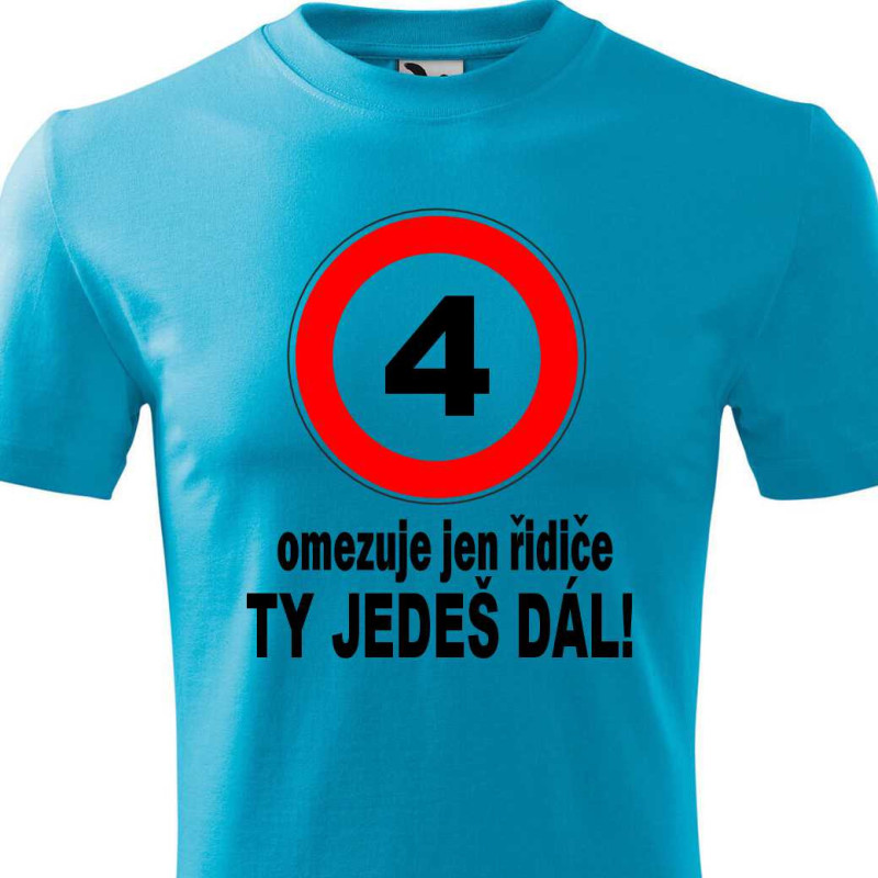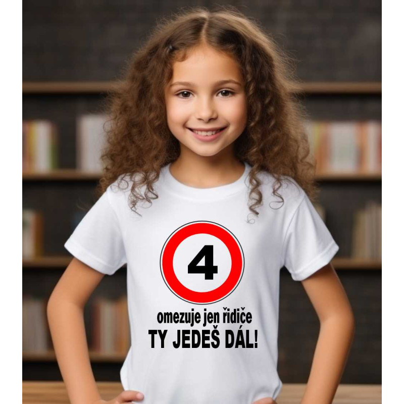 Dětské tričko s krátkým rukávem s potiskem: 4 omezuje řidiče ty jedeš dál. Tričko je skvělé k oslavě 4 narozenin. Udělejte radost malému oslavenci, ať už je to kolka nebo kluk. Kvalitní tričko najde použití i po oslavě a hlavně udělá velkou radost.