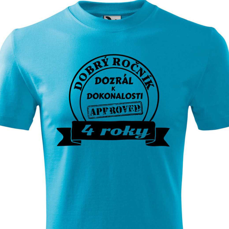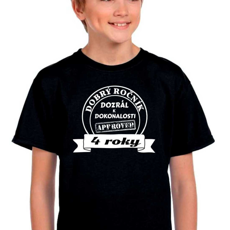 Dětské tričko s krátkým rukávem s potiskem: 4 roky dobrý ročník. Tričko je skvělé k oslavě 4 narozenin. Udělejte radost malému oslavenci, ať už je to kolka nebo kluk. Kvalitní tričko najde použití i po oslavě a hlavně udělá velkou radost.