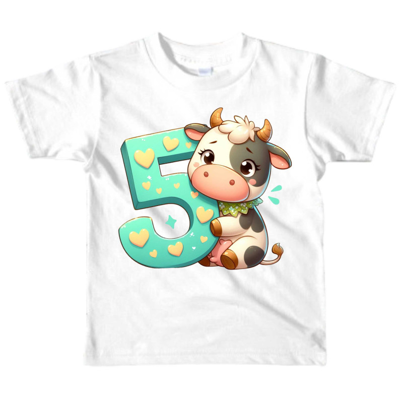 Páté narozeniny jsou velká událost! Překvapte malého oslavence tímto barevným narozeninovým tričkem s roztomilou kravičkou a číslem 5. Skvělý outfit na narozeninovou party i krásná památka na tento speciální den. Ideální dárek k narozeninám, který si vaše dítě zamiluje! Skvělý tip na dárek pro pětiletého oslavence.