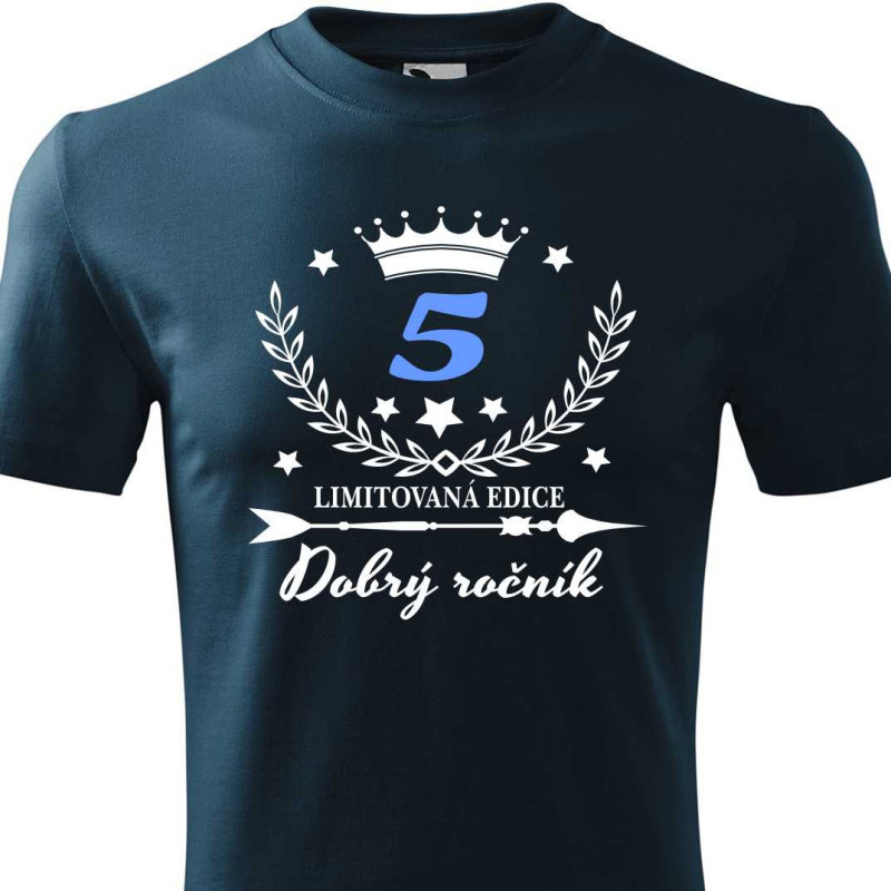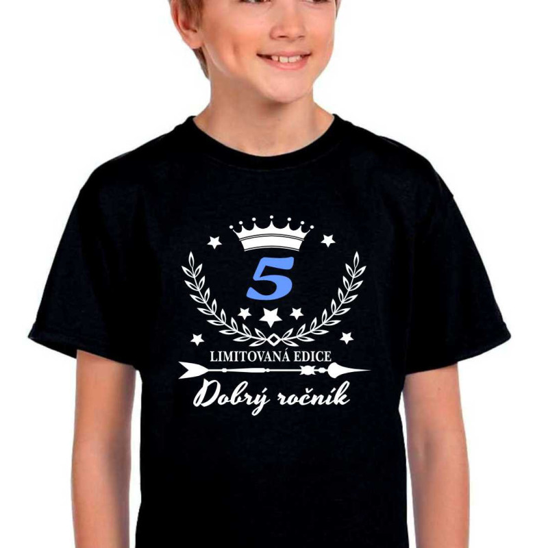 Dětské tričko s krátkým rukávem s potiskem: 5 dobrý ročník limitovaná edice. Tričko je skvělé k oslavě 5. narozenin. Udělejte radost malému oslavenci, ať už je to kolka nebo kluk. Kvalitní tričko najde použití i po oslavě a hlavně udělá nejenom radost, ale i užitek.