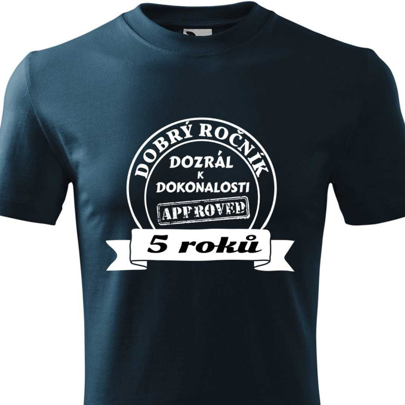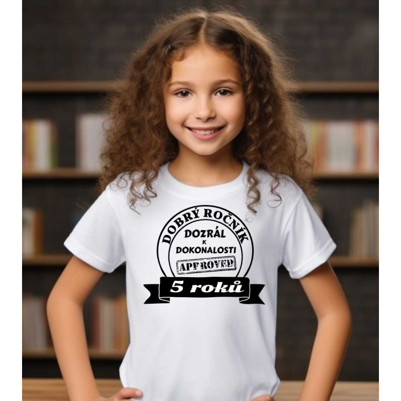Dětské tričko s krátkým rukávem s potiskem: 5 roků dozrál k dokonalosti. Tričko je skvělé k oslavě 5. narozenin. Udělejte radost malému oslavenci, ať už je to kolka nebo kluk. Kvalitní tričko najde použití i po oslavě a hlavně udělá nejenom radost, ale i užitek.