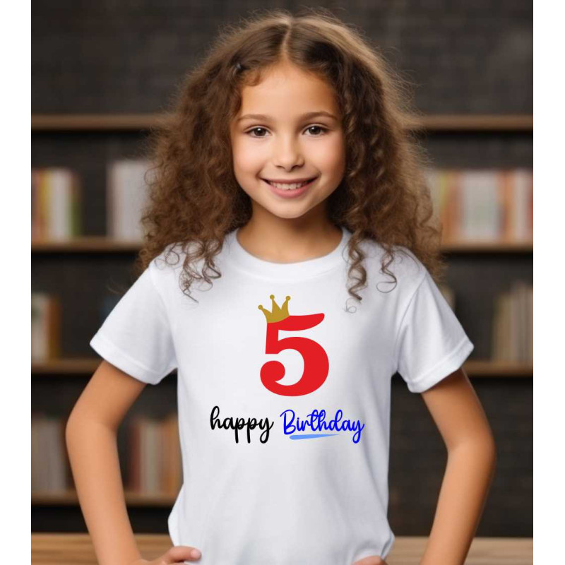 Dětské tričko s potiskem: 5 happy Birthday. Tričko je určené k oslavě 5 narozenin pro dívku nebo kluka.