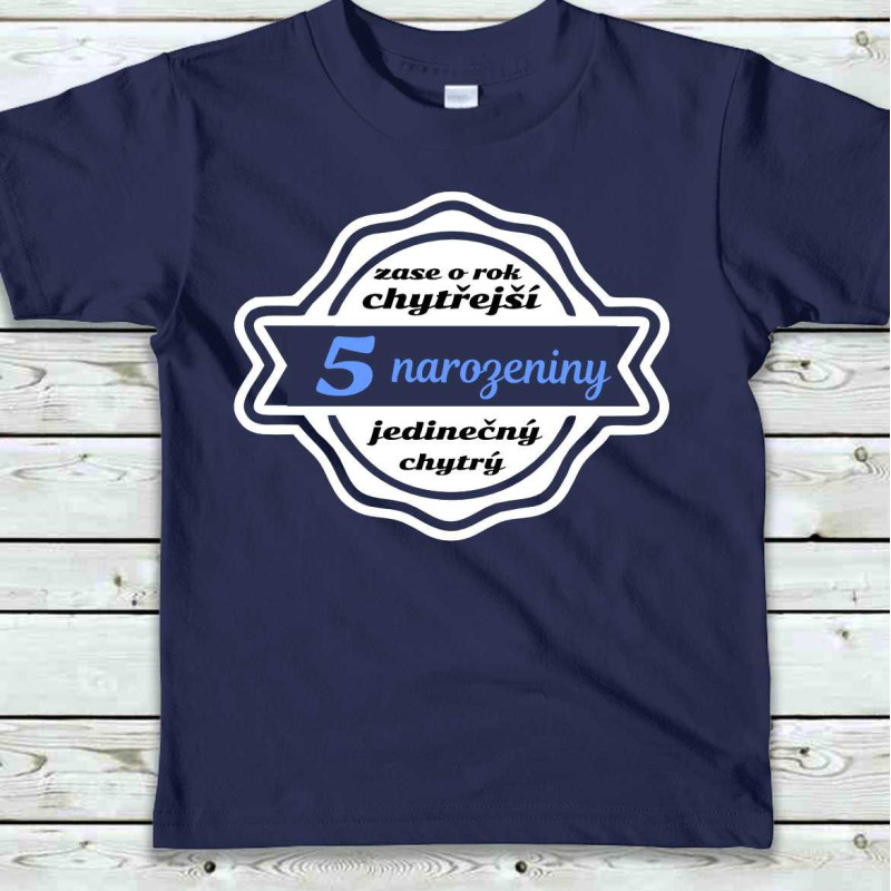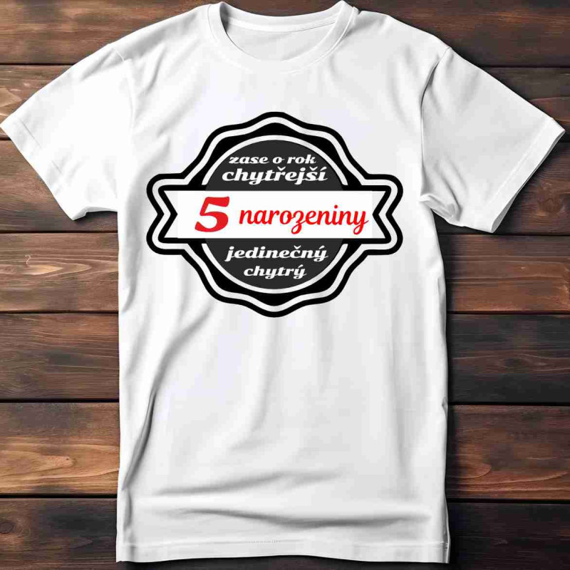 Dětské tričko s krátkým rukávem s potiskem: 5 narozeniny - zase o rok chytřejší. Tričko je skvělé k oslavě 5. narozenin. Udělejte radost malému oslavenci, ať už je to kolka nebo kluk. Kvalitní tričko najde použití i po oslavě a hlavně udělá nejenom radost, ale i užitek.