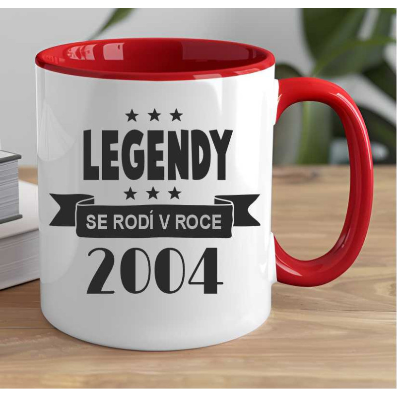 Hrnek k 21. narozeninám s potiskem přední strana: "Legendy se rodí v roce 2004" a zadní strana: "Kávička pro legendu". Udělejte radost k 21. narozeninám hrníčkem, který je skvělým praktickým dárkem.