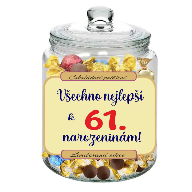 čokoládové bonbony ve skleněné dóze s nápisem „Krásné 61 narozeniny“
